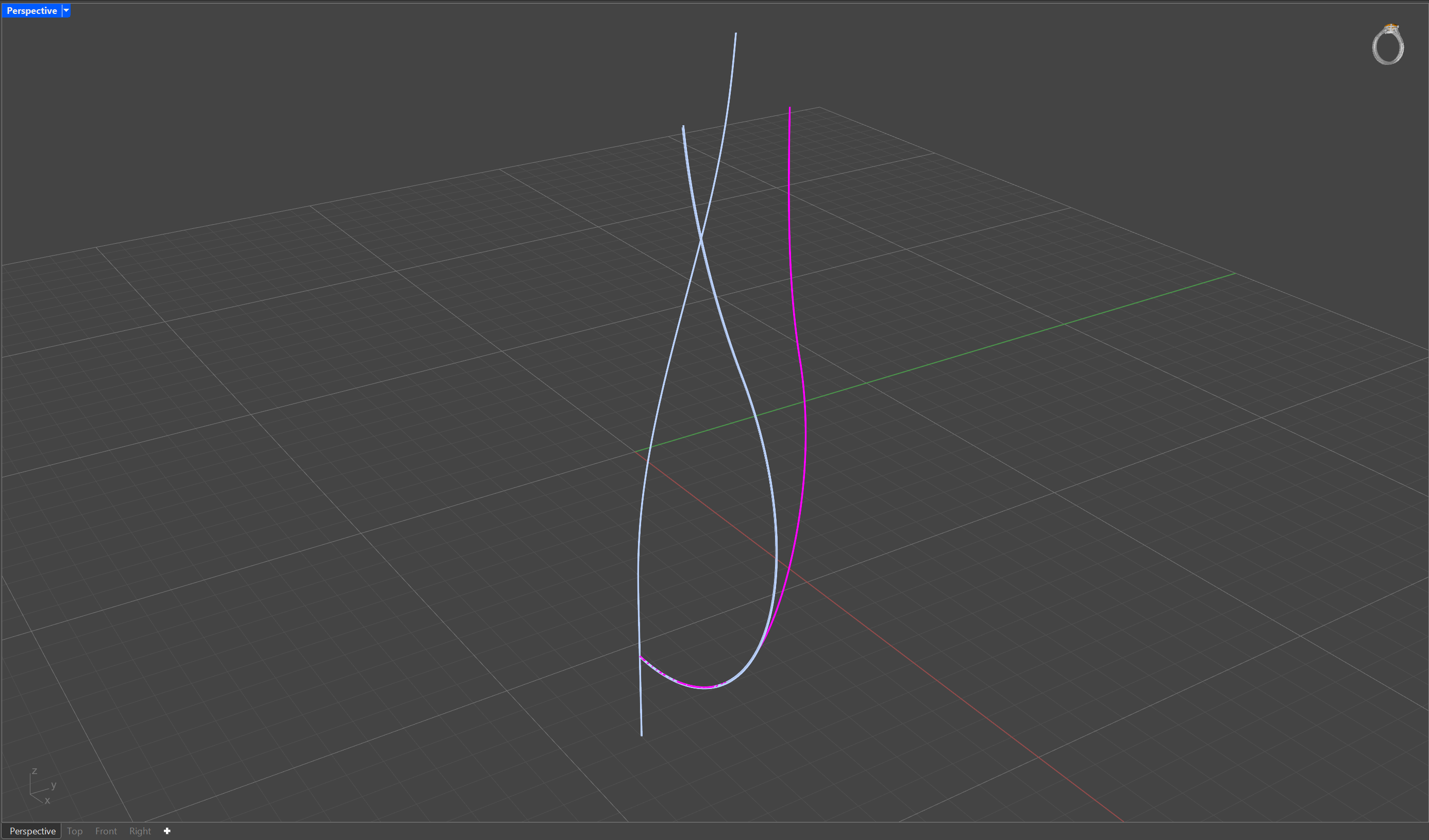 The **Crv2View** command projects a curve into a selected view, aligning it to the current viewport. You can control the curve's position, scale, and orientation by specifying the desired view and adjusting the projection settings. This command is particularly useful for creating designs that require precise alignment or visual transformations, often in jewelry design when projecting patterns or details onto surfaces.