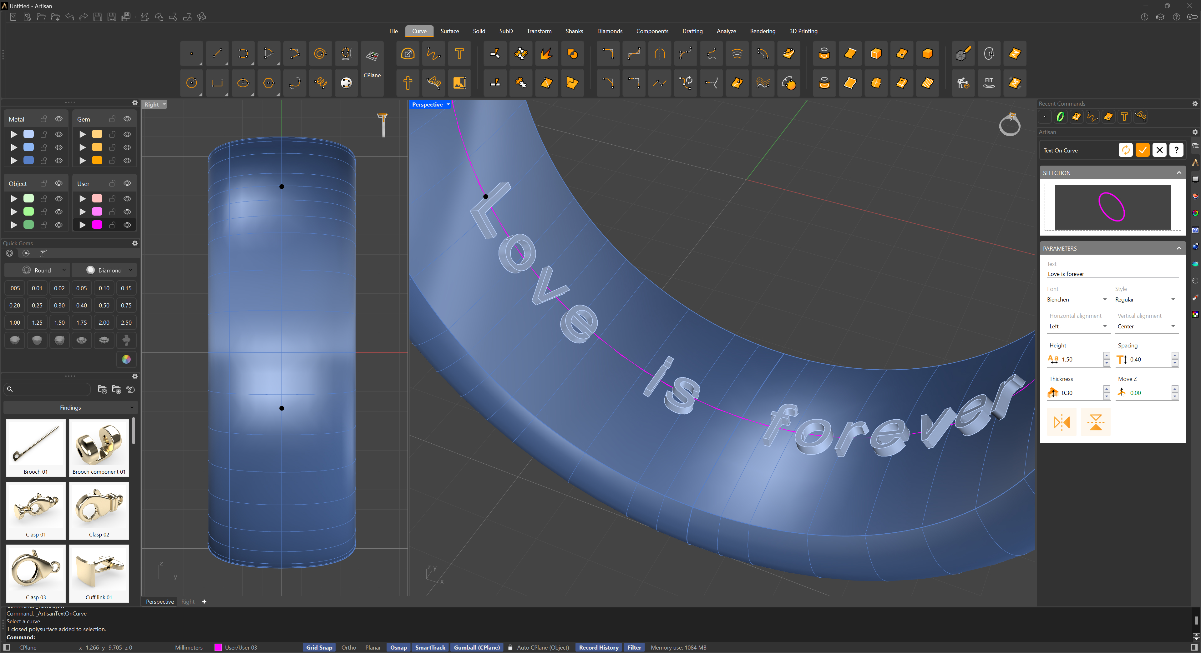 **Goldsmith Tip:** Using this method, you can easily create a nameplate pendant or an engraved metal plaque. Start by drawing the outline of the plaque and adding a curve to define the path where the letters will follow. Use the "Text on Curve" command to place the letters along this path, then give them thickness to create a solid shape. Move the letters downward in the -Z direction to intersect with the plaque. Next, a Boolean Difference operation is performed between the plaque and the letters to engrave the text.