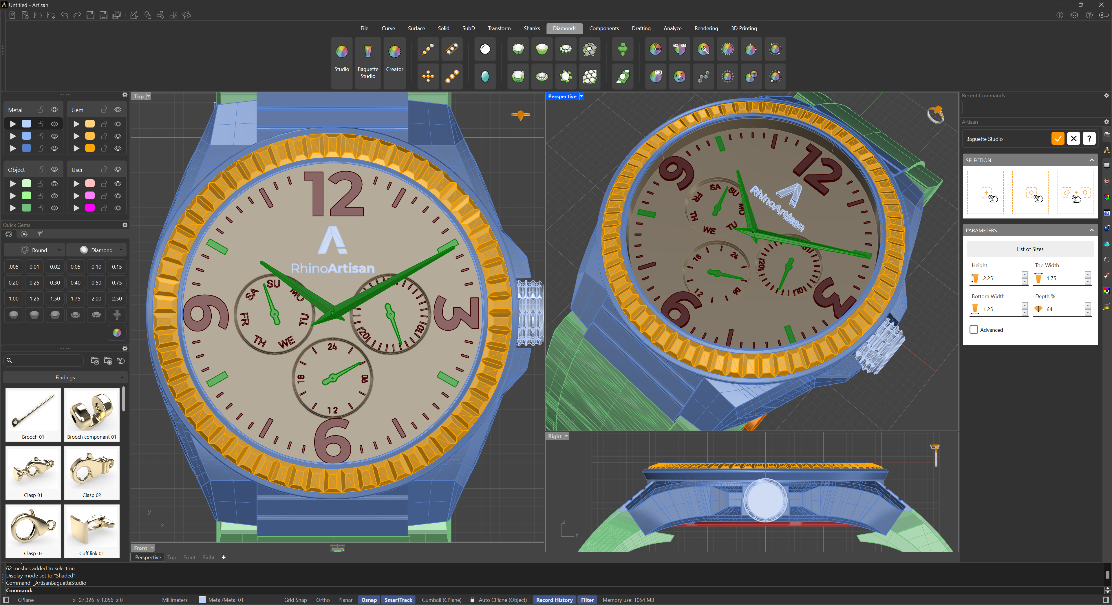 **Goldsmith Tip:** Designing pieces with multiple baguette stones can be challenging, especially when dealing with tapered baguettes that must be placed close together. Achieving precise and accurate placement of these stones is crucial in such cases. RhinoArtisan has introduced the Baguette Studio command to assist jewellers in creating designs with baguette cuts with unparalleled precision.