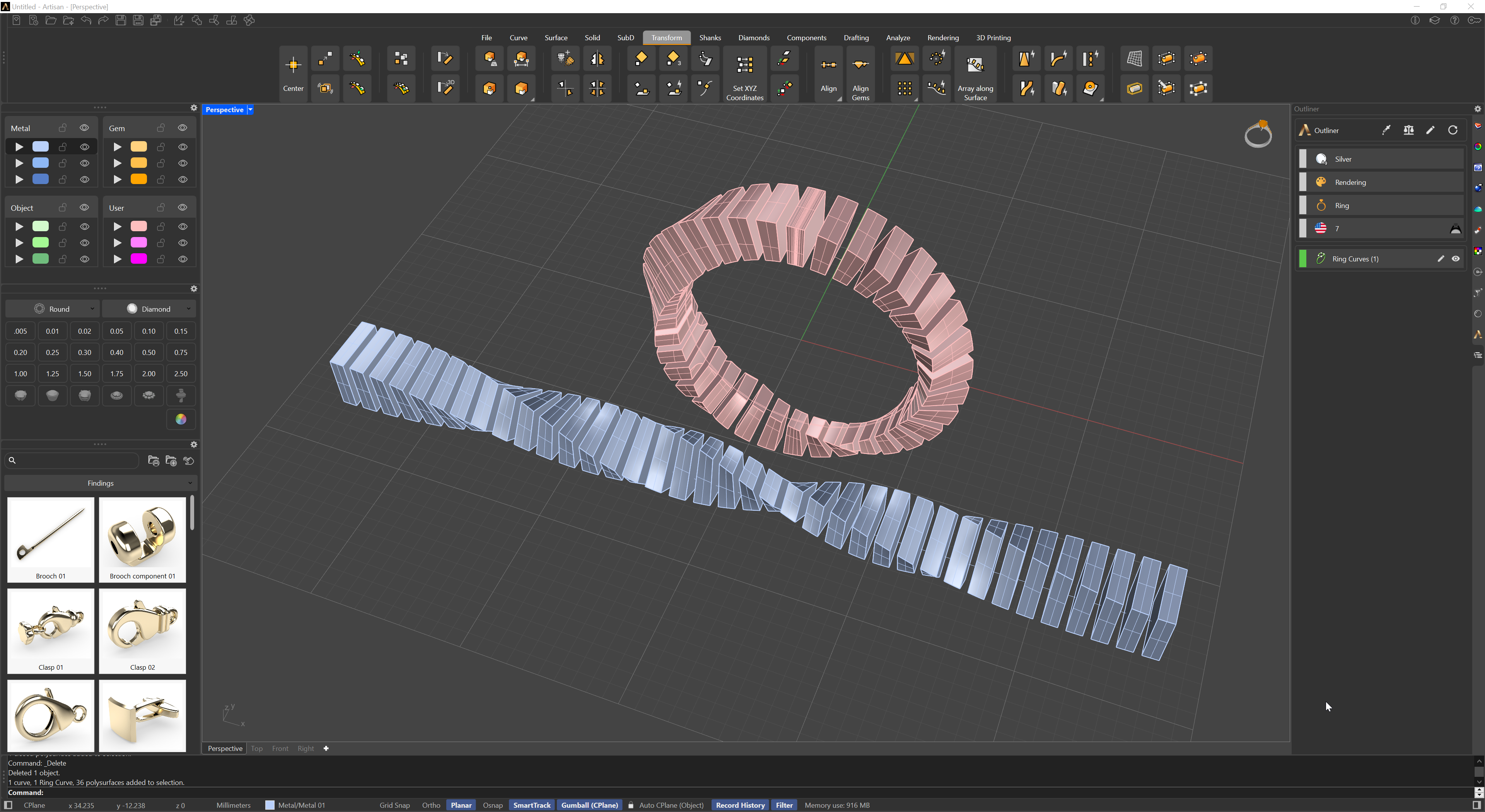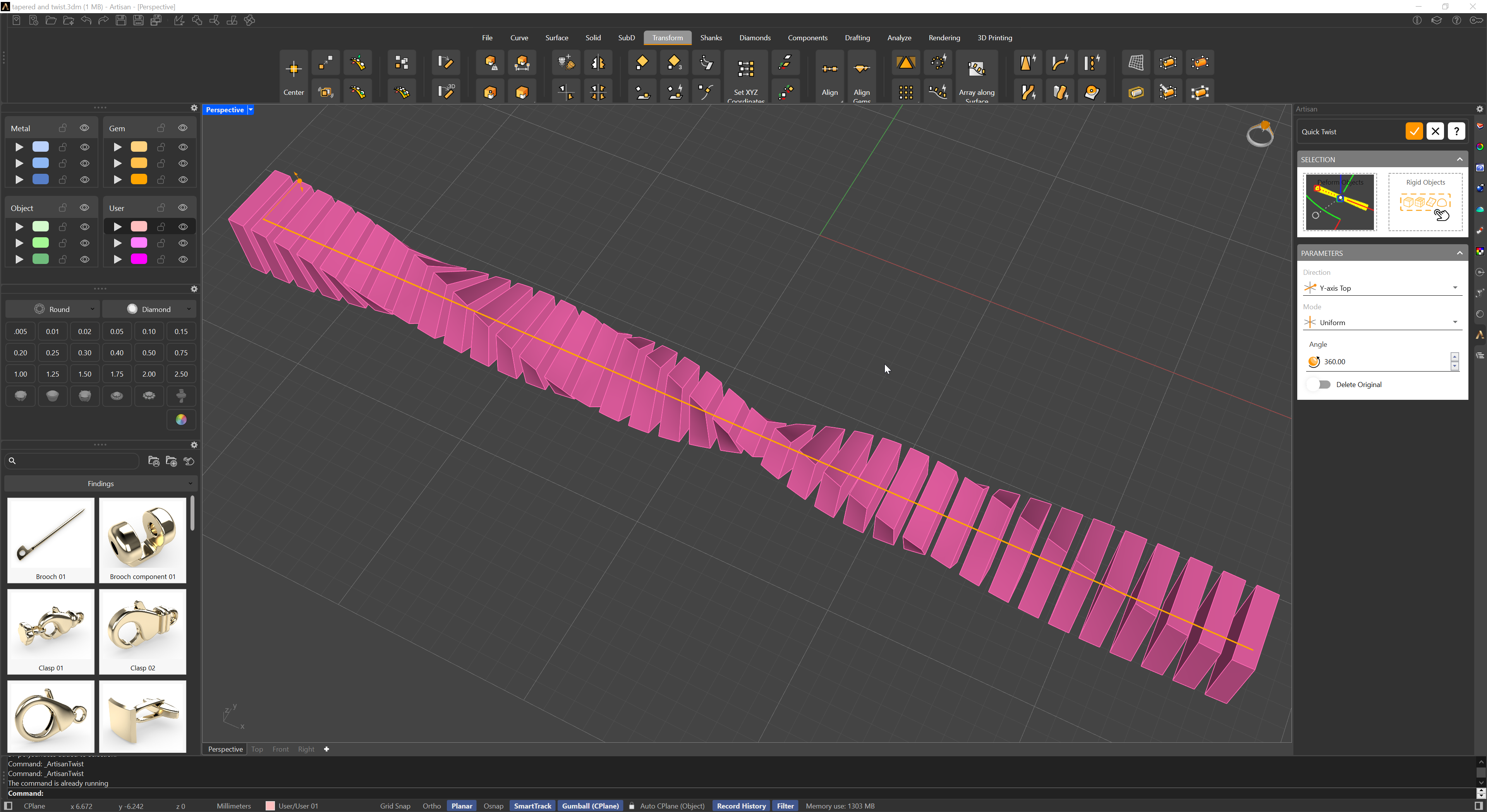 **Goldsmith Tip**: By combining multiple deformations like **Quick Taper** and **Quick Twist**, and then flowing the result along a curve using **Quick Flow**, you can create truly exotic and intricate shapes. This process gives you full control over the design, allowing for complex and unique distributions in your piece.