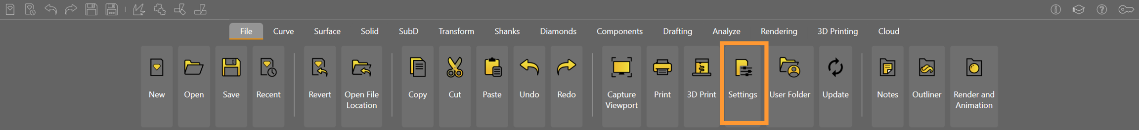 Now we will go to the RhinoArtisan options. In RhinoArtisan mode, click on Settings in the File tab.