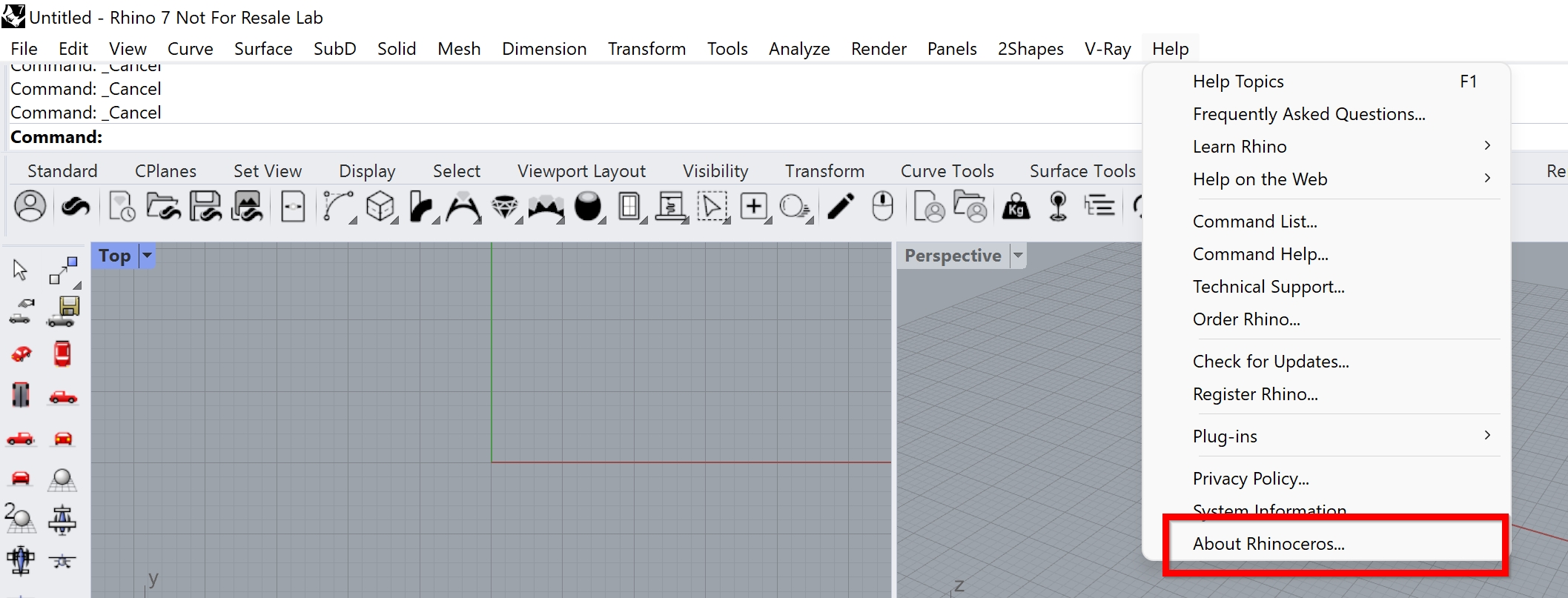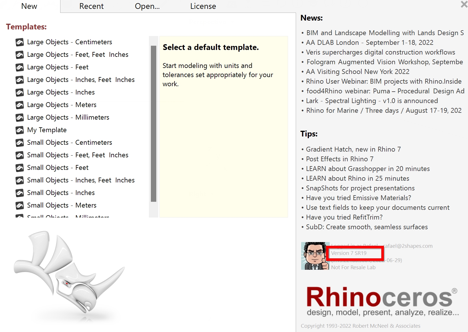 In the right-bottom area of the window, you will see the version. In our case is Rhino 7.0 SR19.