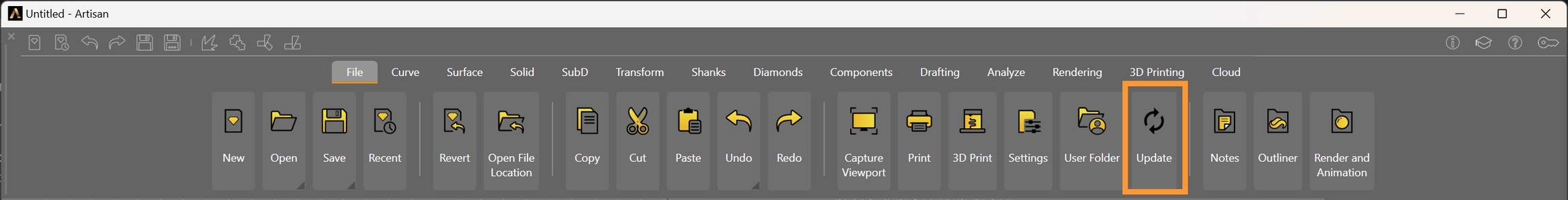You can also update RhinoArtisan manually by clicking on the Update button on the File tab.