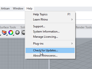 Let's check what Rhino version we are using. To do this, we will open Rhino, in the menu Help > Check for Updates...