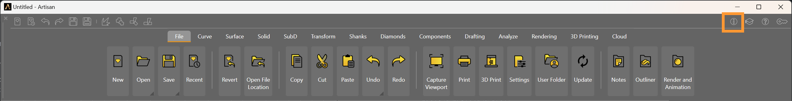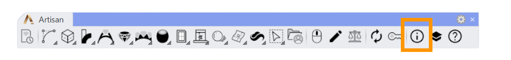 <figure><img src="https://content.gitbook.com/content/5uhW8FwQpXQj8tHUULMo/blobs/WNwYyNTb5HporsRlA6ia/About%20Icon.png" alt=""><figcaption><p>About icon on the RhinoArtisan toolbar</p></figcaption></figure>