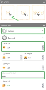 Select "Cushion" as the shape and set the size to 2 carats. Align the gem to the Culet, then press "Add."