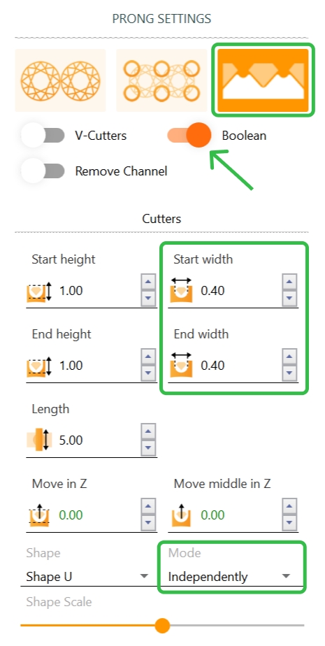 In the "Prong Settings" tab, activate the third option (scalloped) and the "Boolean" option. Adjust the cutter parameters: