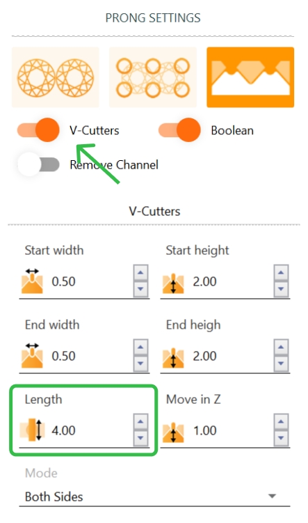 In the V-Cuters section, adjust the length to 4 millimeters and activate the "V-Cuters " option.