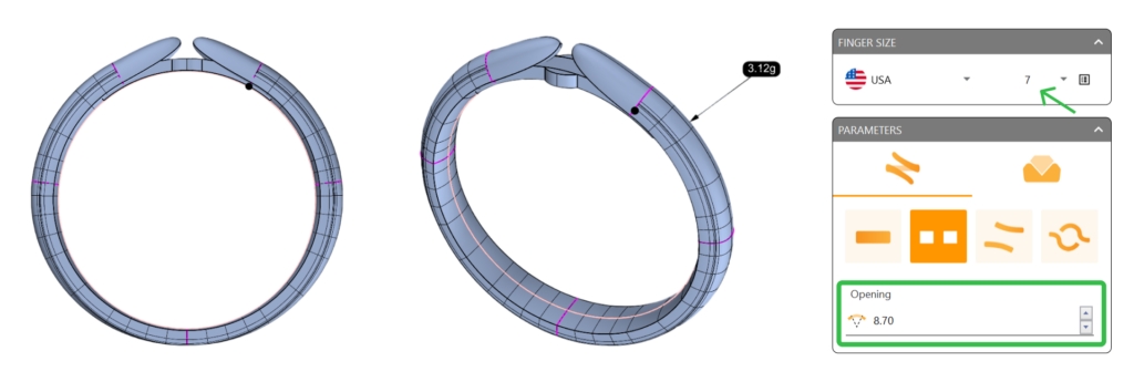 Ensure the size matches the reference curve by selecting "United States of America" and setting the size to 7. Change the Opening to 8.70 millimeters.
