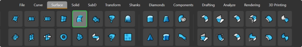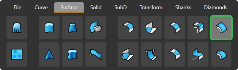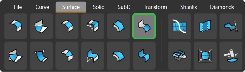 In the Surface tab, use the Loft command.