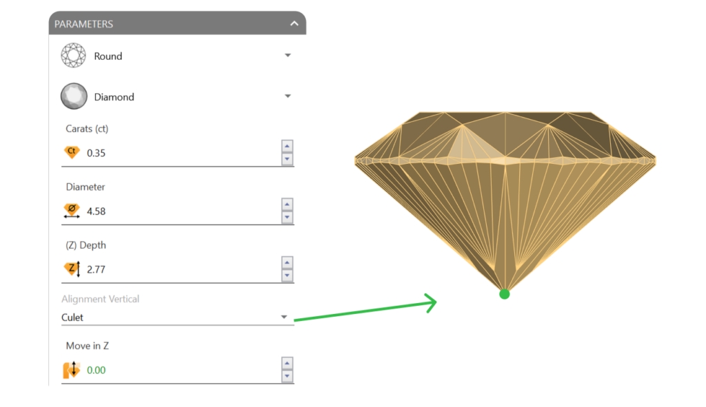 Go to the Diamonds tab and use the Gem Studio command to create a 0.35-carat gem. Change the alignment to Culet.