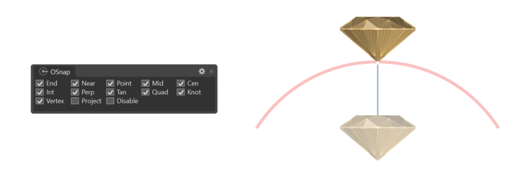 With the osnap aids enabled, position the gem at the top of the reference curve.