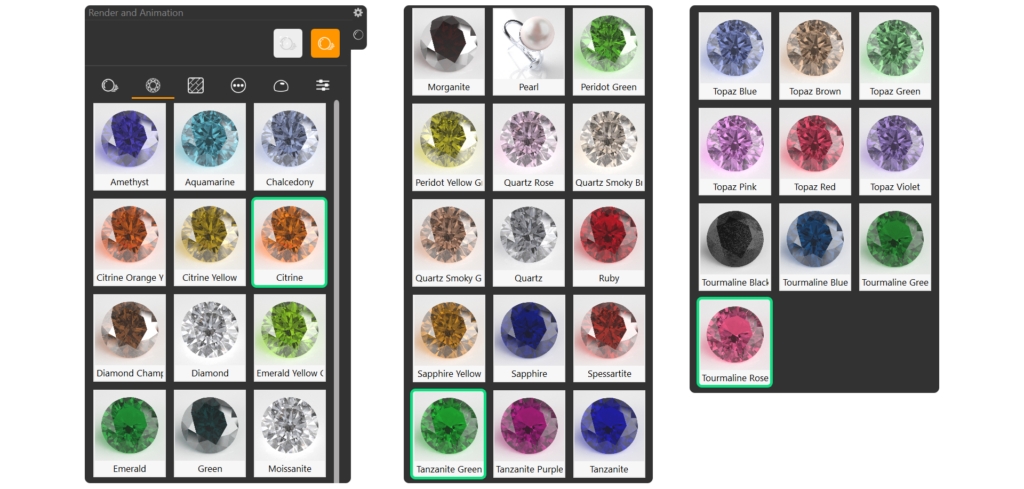 Select the green gems and apply Tanzanite Green from the Gems tab. Apply Tourmaline Rose to the pink gems. Apply Citrine to the orange gems.