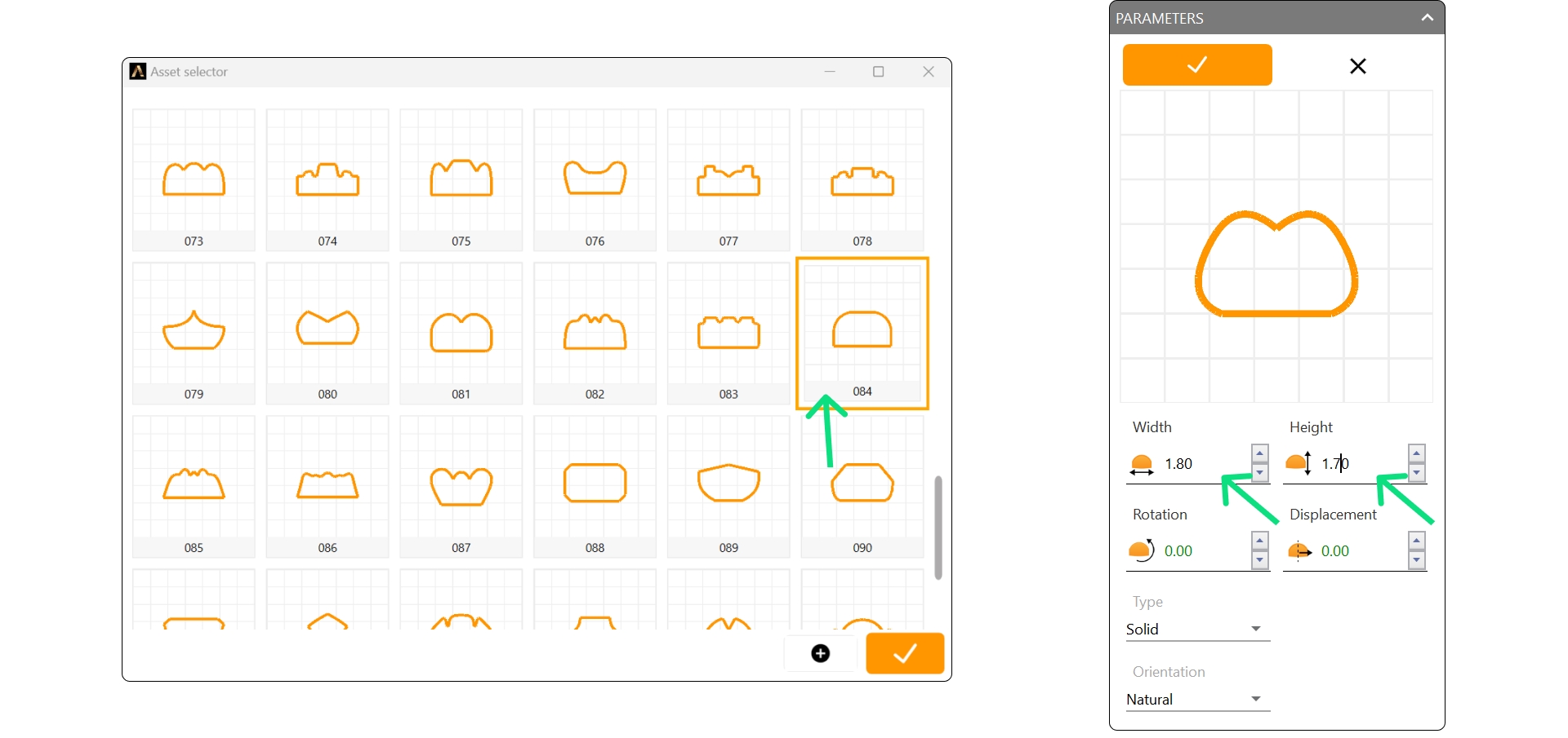 Change the profile curve to number 084, then adjust the width to 1.8 mm and the height to 1.7 mm.