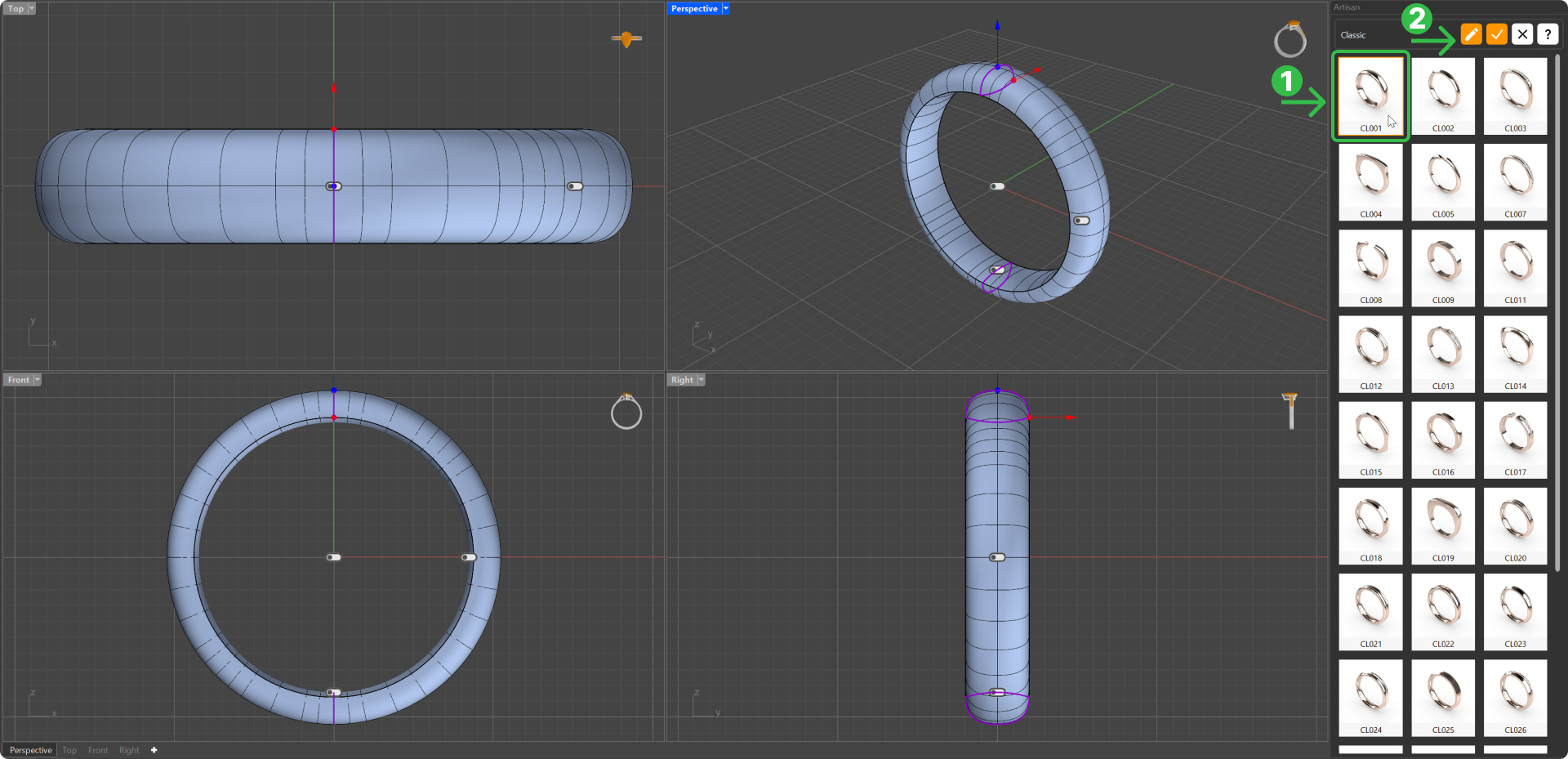 From the RhinoArtisan library, choose the model "CL001" (1), then click on Edit (2).