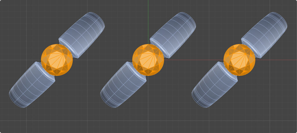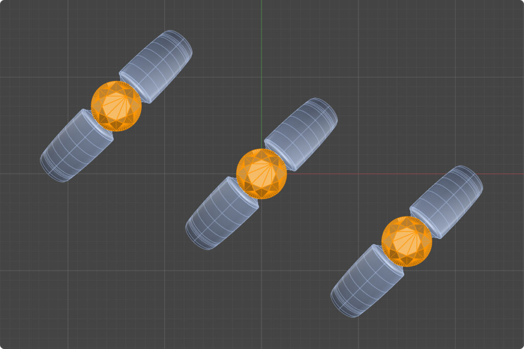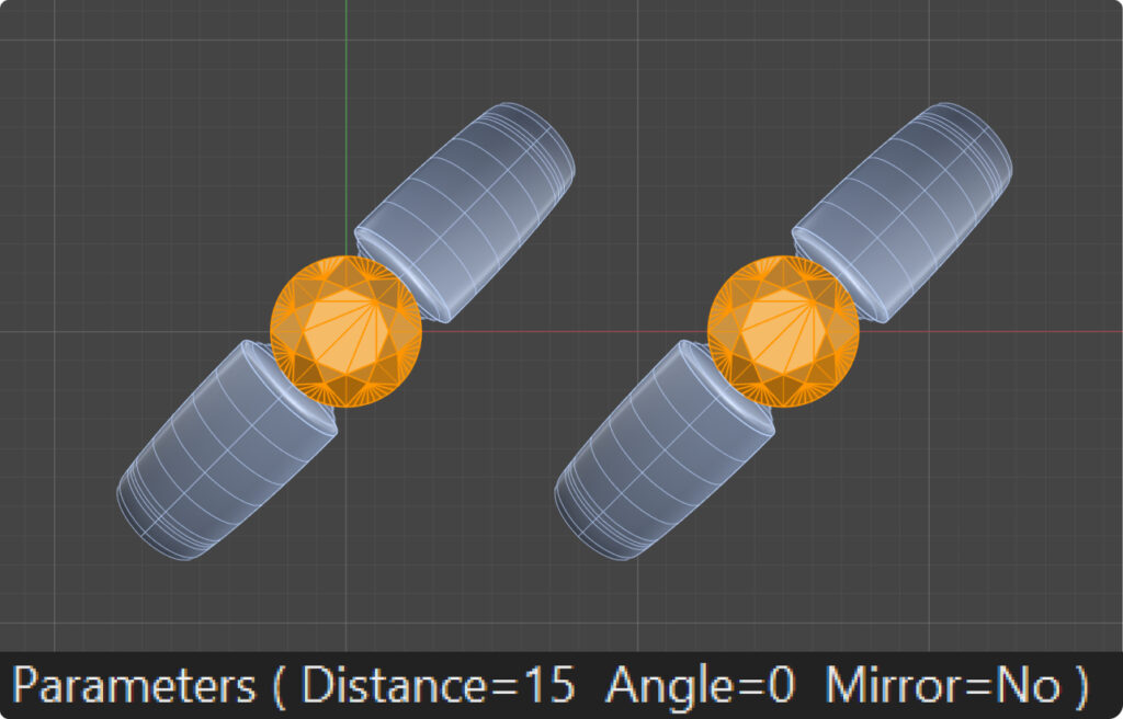 Go to the "Rendering" tab and select the "Pair" command. Select the shank and the gems, press enter. In the command prompt type 15 milimiters for the distance, for the angle type 0.