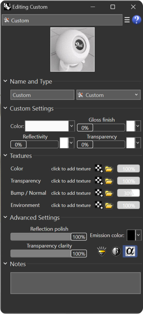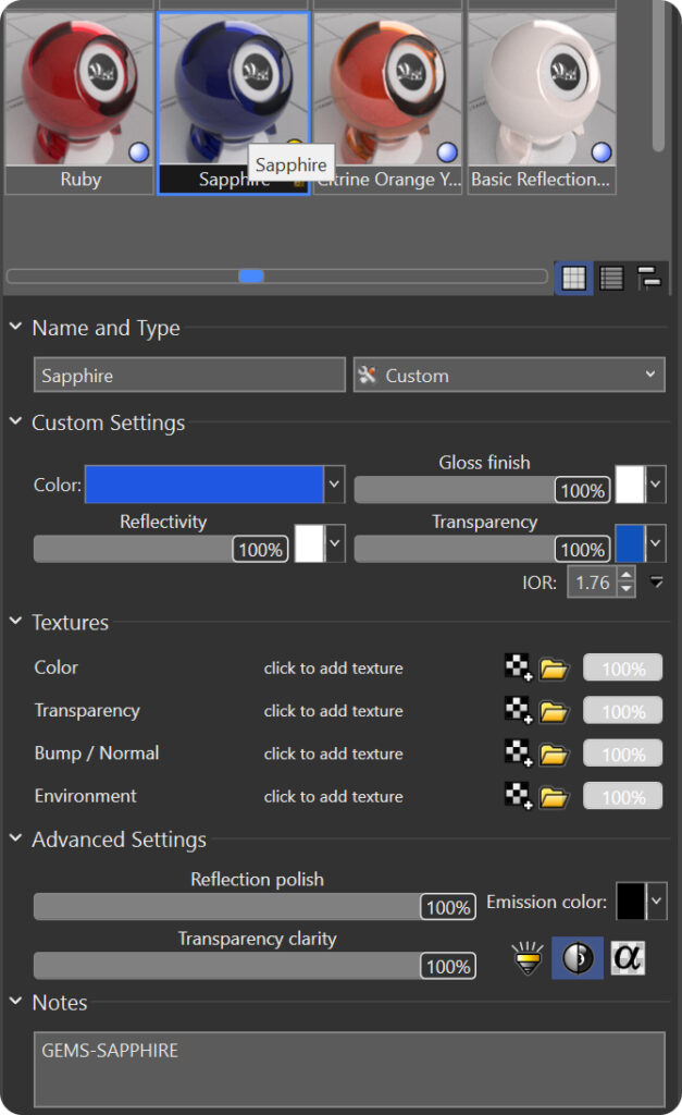 Textures: Textures (bitmap images or algorithmic textures) can be used for color, transparency, bump, and environment.