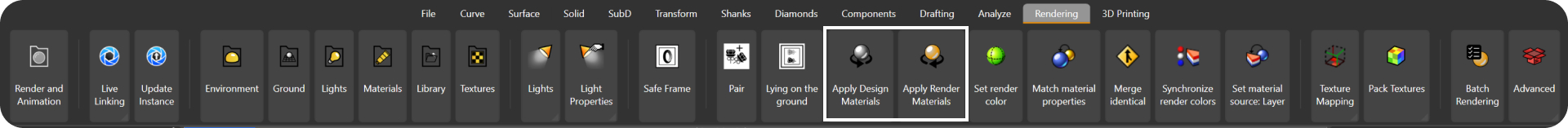 As we can see in the top menu, in the Rendering tab, we can apply two types of materials.