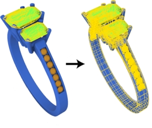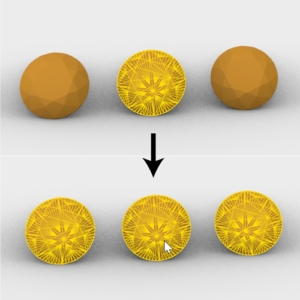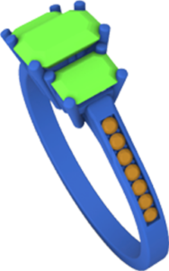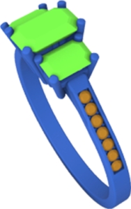 Let’s suppose that, as in the image, our model is composed of three gems, which will have the same material, a series of diamonds, which will also have the same material, and a metal. But all the elements are grouped together so that when we click on an element, we select the whole object.