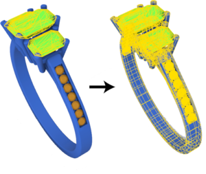 Our main interest is to divide the model into its different elements, in this case, into three (gems, diamonds, and metal). When we click on the model, it automatically selects all the elements. To divide it, we will use the command bar at the screen’s bottom left.