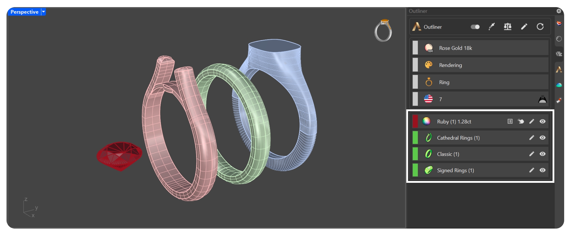 The Outliner menu allows us to see all the elements that compose our scene. We can also select by clicking on the name of the list, another interesting option is to hide/show each element by clicking on the eye icon located on the right.