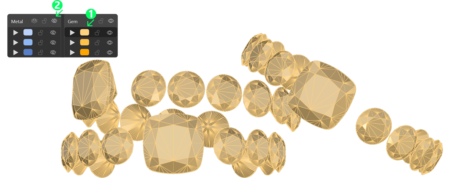 Reveal the metals layer and hide the gems to apply the metal materials.