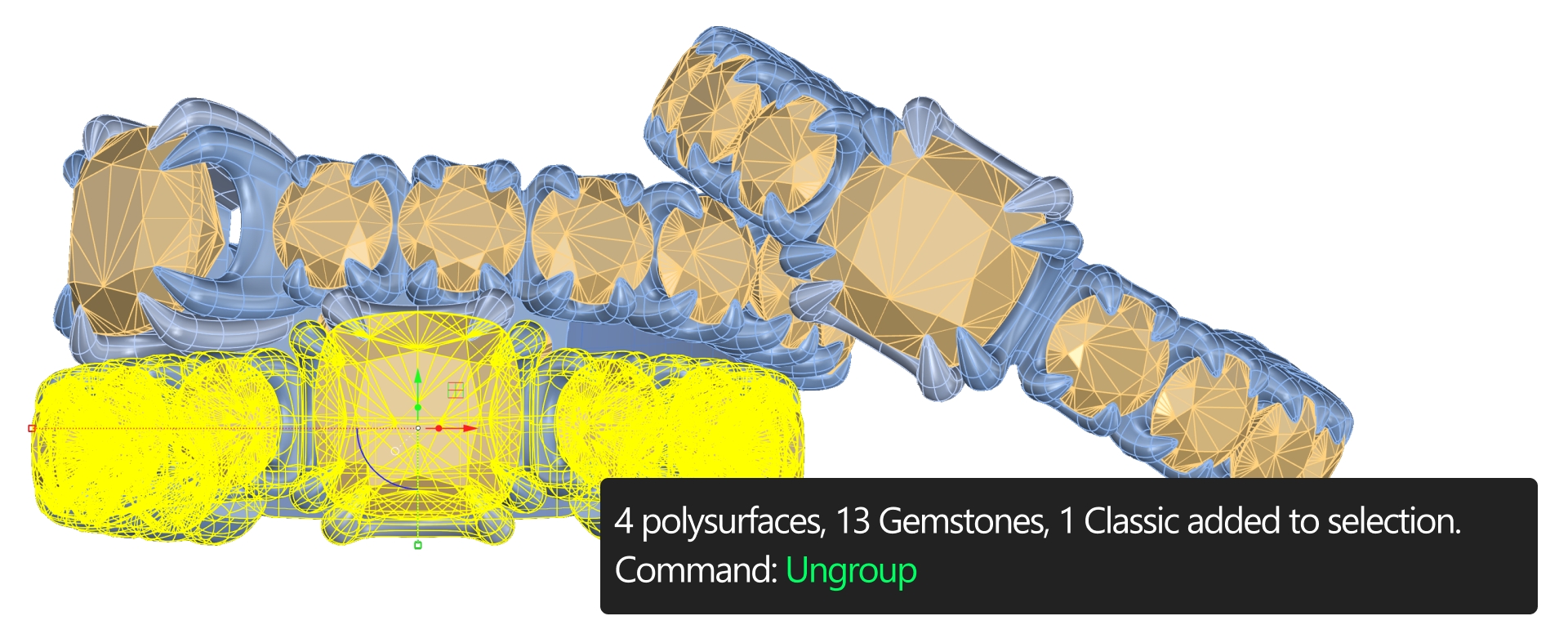 Ungroup the gems of the second ring. Apply the Citrine Orange material to the main gem and Tourmaline Rose to the side gems.