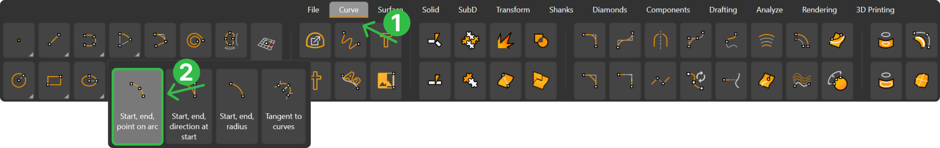 To start, go to the Curve tab and locate the Arc submenu. Use the Start, End, Point on Arc command.