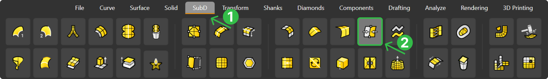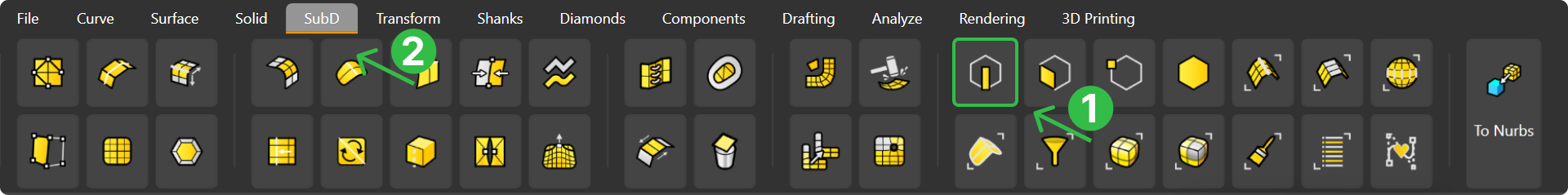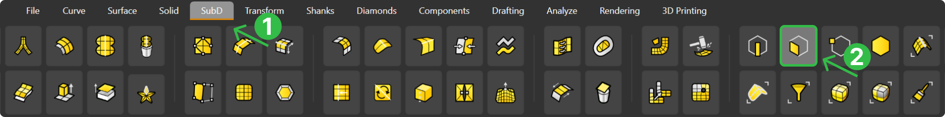 Switch to the SubD tab (1), use Face Selection (2).