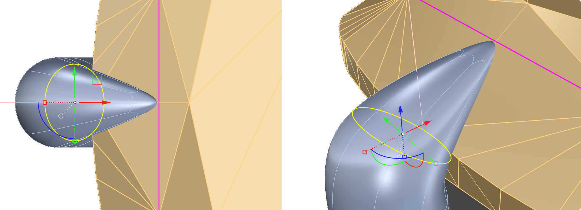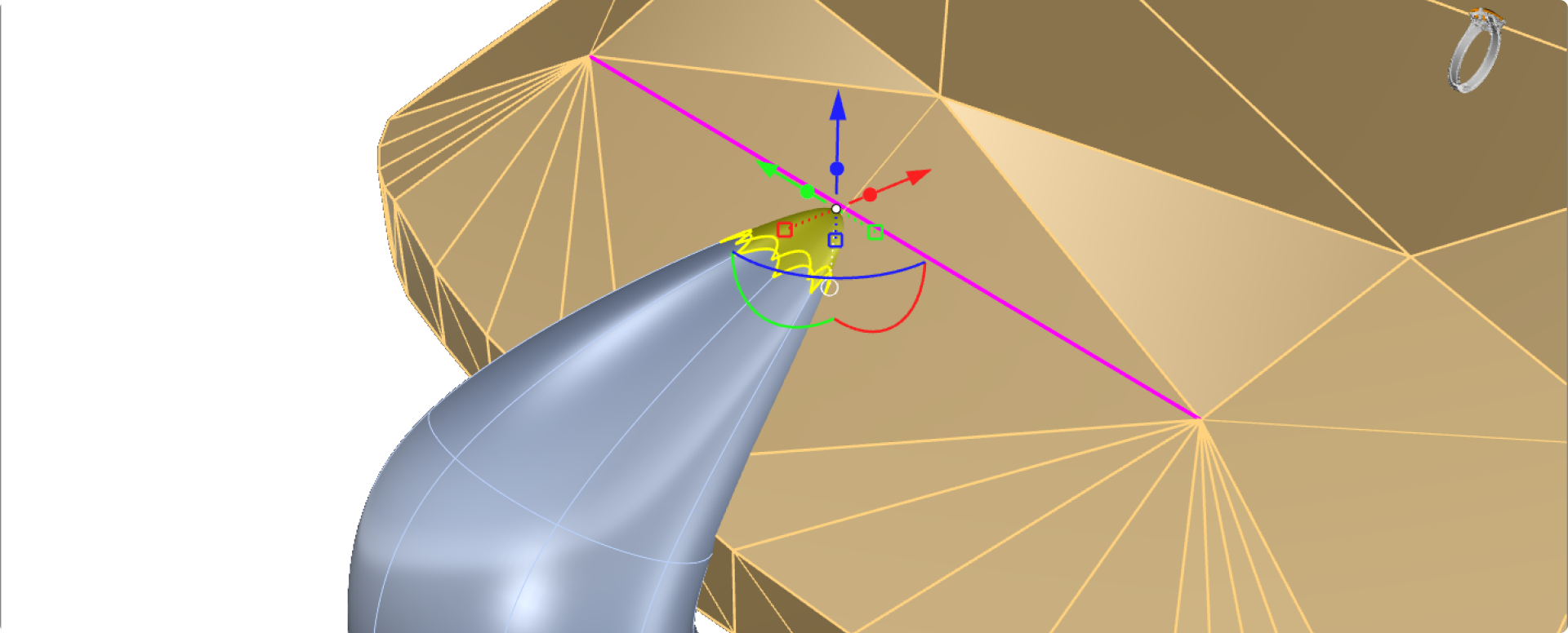 Use the gumball in the front view to move only the red and blue arrows to position the tip of the prong. To visualize what you are doing, use the other views, especially the perspective view and the top view. It’s important to move only from the front view to avoid altering the alignment of the prong.