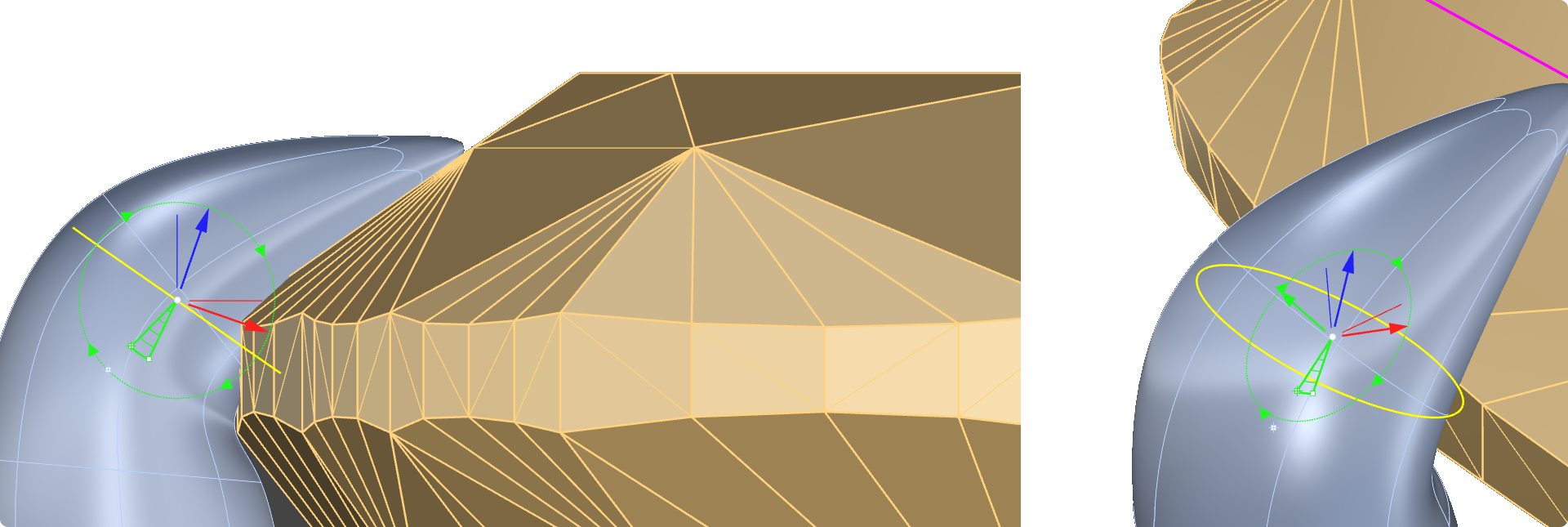 Rotate whith the green circle and smooth the edge using the Gumball tool.