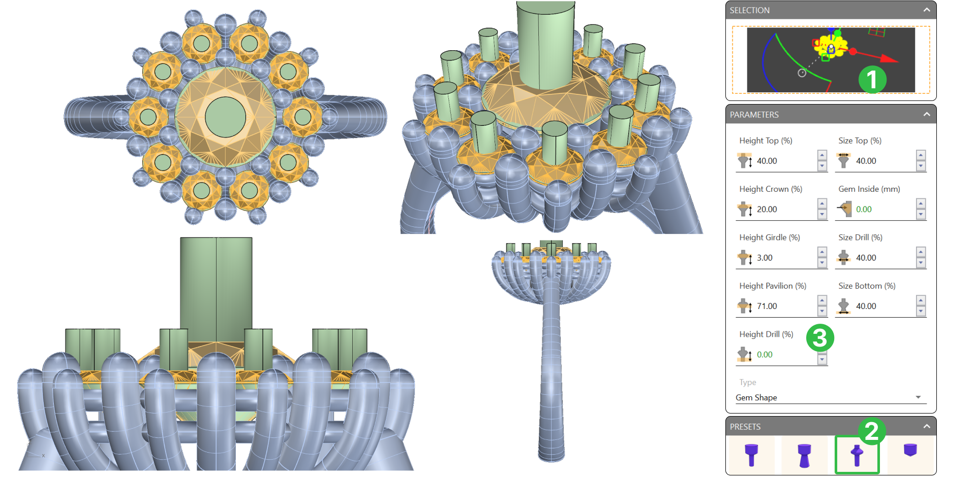 Configuring the Cluster Prongs Adjust prong settings to securely hold gemstones in place while keeping alignment. Fine-tune parameters for size, spacing, and extension.