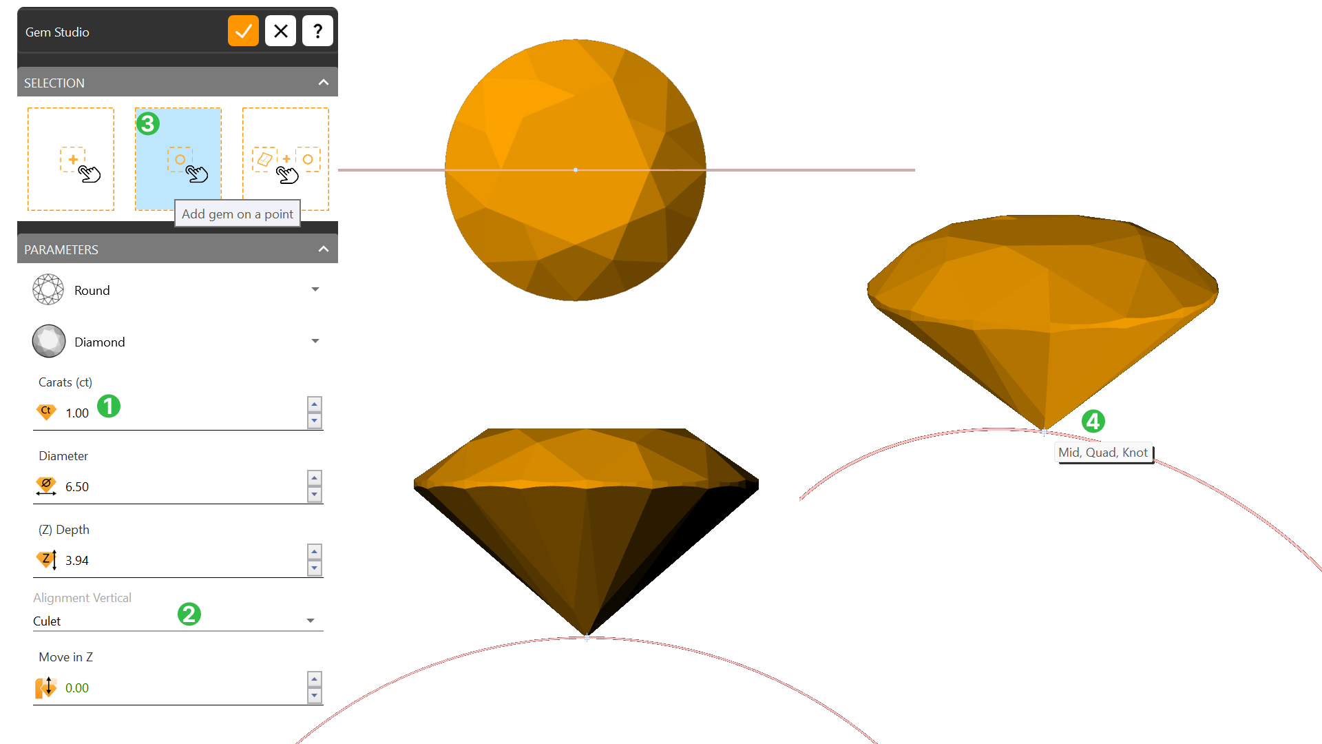 Create the Centerpiece Start by crafting the cluster centerpiece—a brilliant 1-carat diamond. Set your scene with a clear visual by switching to the Shaded Display Mode for better clarity.