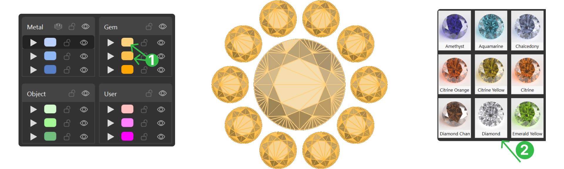 Use the Layers Panel to select the gems and apply a diamond material to them.