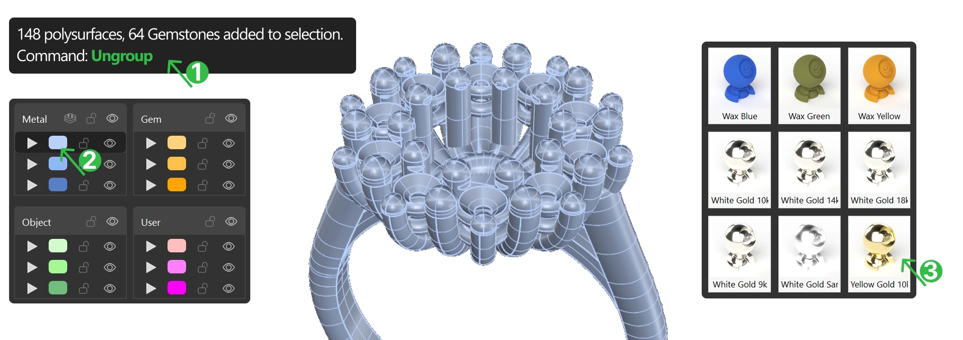 With all components in place, our Classic Cluster Ring is ready for rendering. At this point, we’ll visualize the design and check that all elements fit together perfectly.