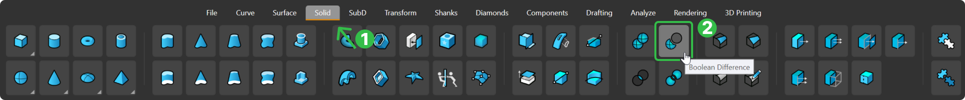To cut the metal using our cutters, go to the Solidtab (1) and select the Boolean Difference command (2).