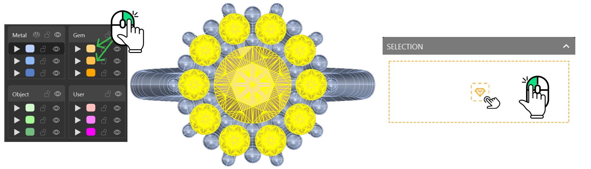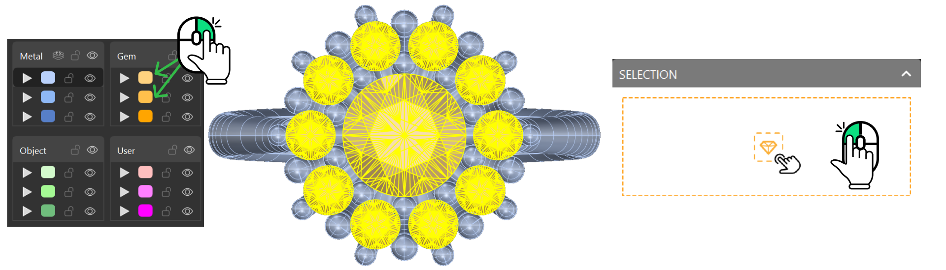 Now use the Layers panel to select the gems. To do this, right-click on the colors designated for gems specifically, the first two orange ones.