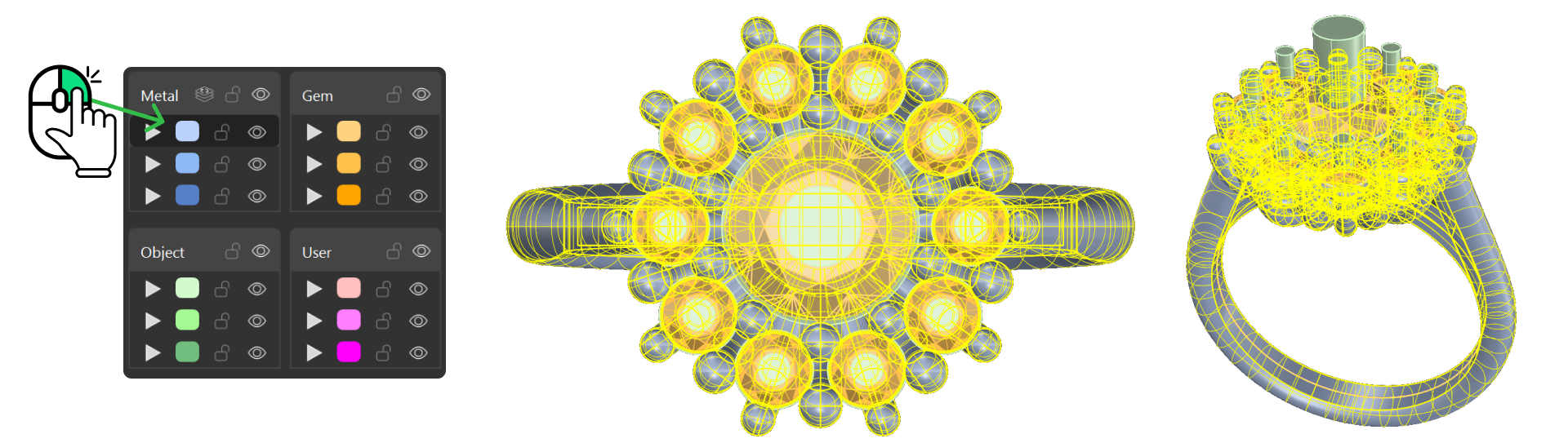 Before applying our materials, we will use cutters to remove the metal that intersects with the gems. This way, we will ensure that light interacts with the material properly, allowing us to see the sparkle of our gems.