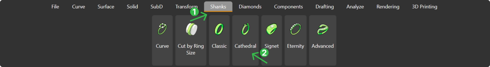 Go to the Shanks (1) tab and select the Cathedral (2) command.