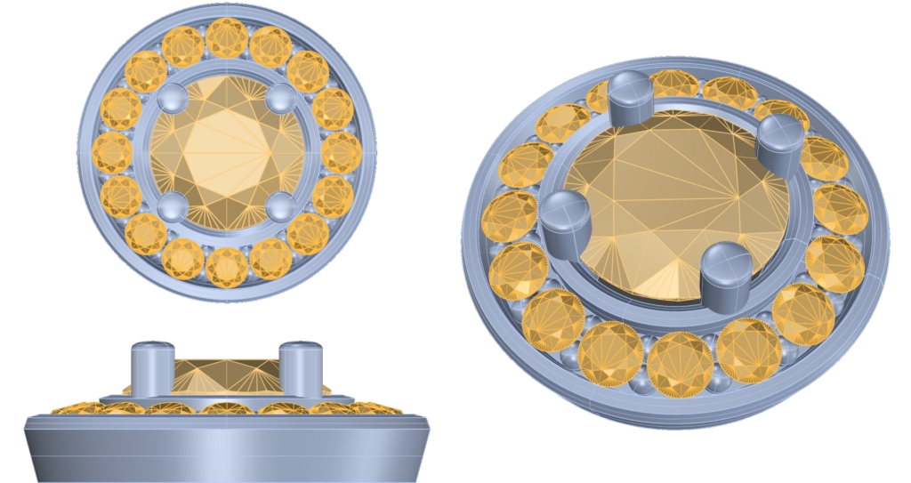 Add a halo to accentuate the center diamond. Modify gem size, spacing, and prong settings for a perfect fit, with settings for vertical alignment, inner height, and prong height. Customize the drill holes to enhance the setting’s detail and stability.