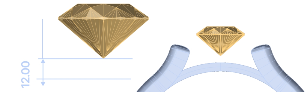 Use the Gumball tool to move the diamond. Click on the green arrow in the front viewport and type 12.0 mm to place it correctly.
