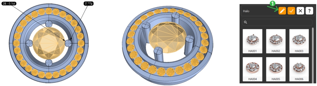 Design the Halo Setting Build a beautiful halo that highlights the center diamond. Adjust the width, height, and prongs to create a balanced, eye-catching setting around the gemstone. Refine every prong, drill, and inner gem distance for that perfect touch.