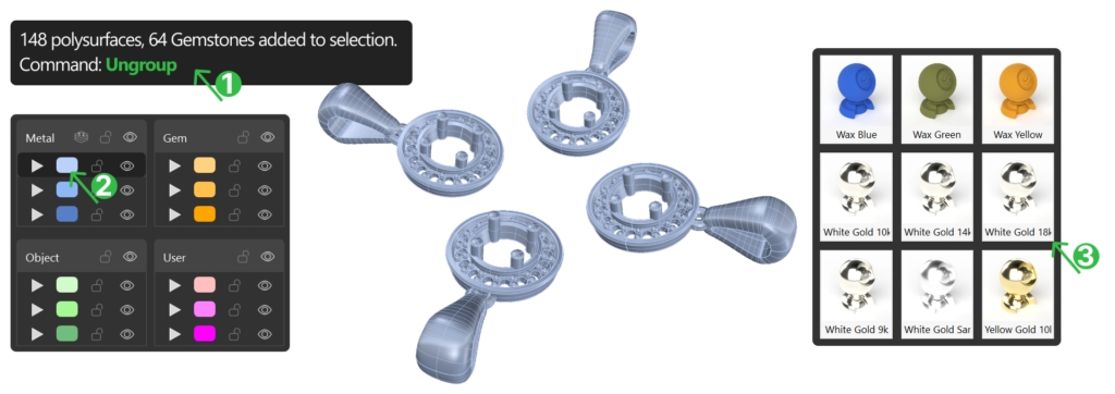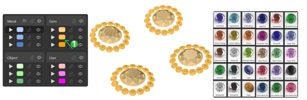 Use the Layers Panel to select the gems and apply a diamond material to them.