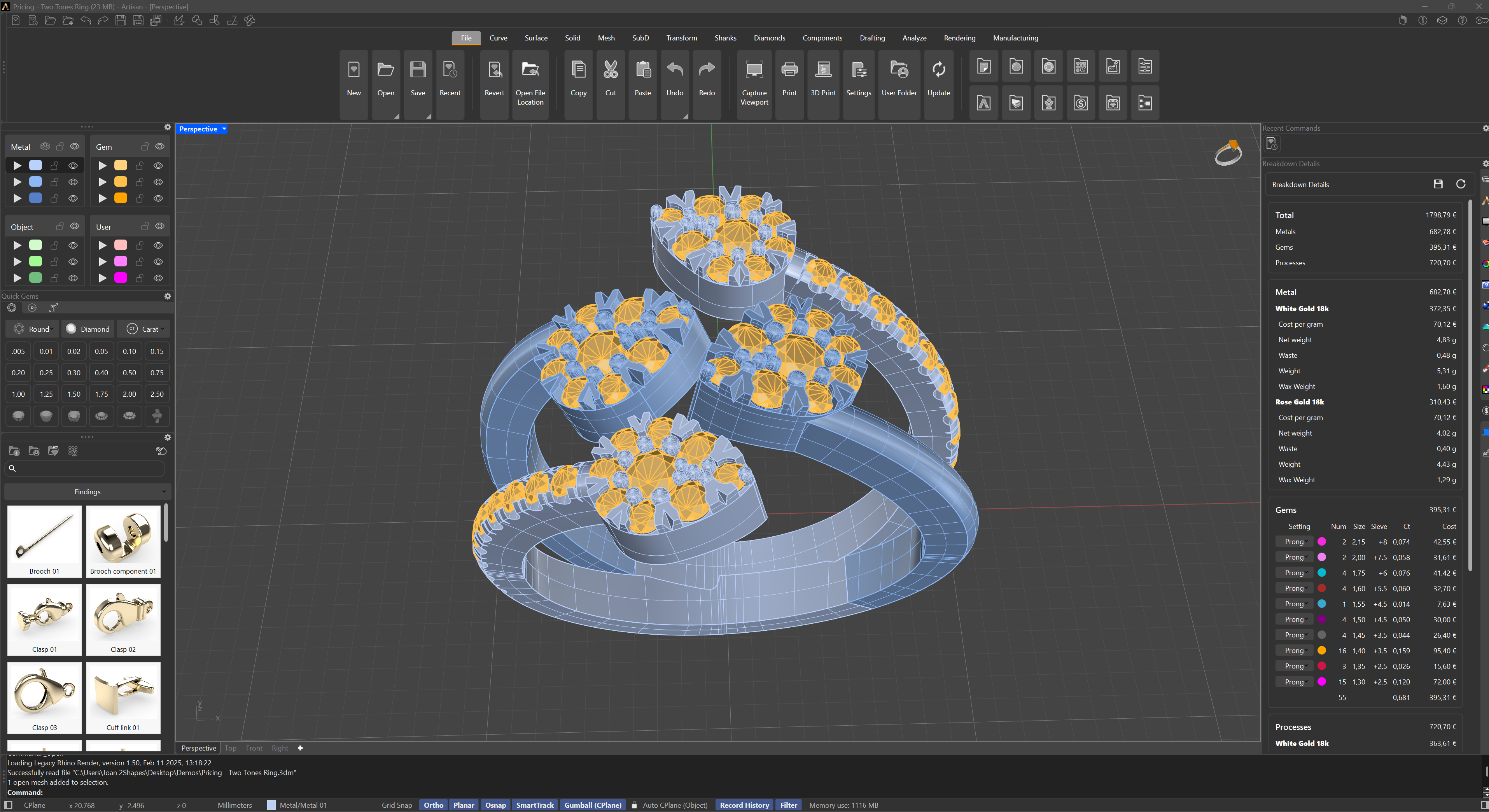 • The design includes 3,47 grams of gold white 18, priced at 70,12 per gram. This metal contributes a total of 243,46 EUR.