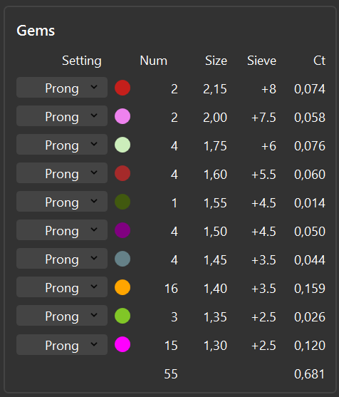 This section displays a list of diamonds used in the design, sorted by size. Users can select the **setting type** for each line in the list, along with the **color coding** (defined in the [**Artisan Options**](https://docs.rhinoartisan.com/user-interface/options)). Additionally, it details: