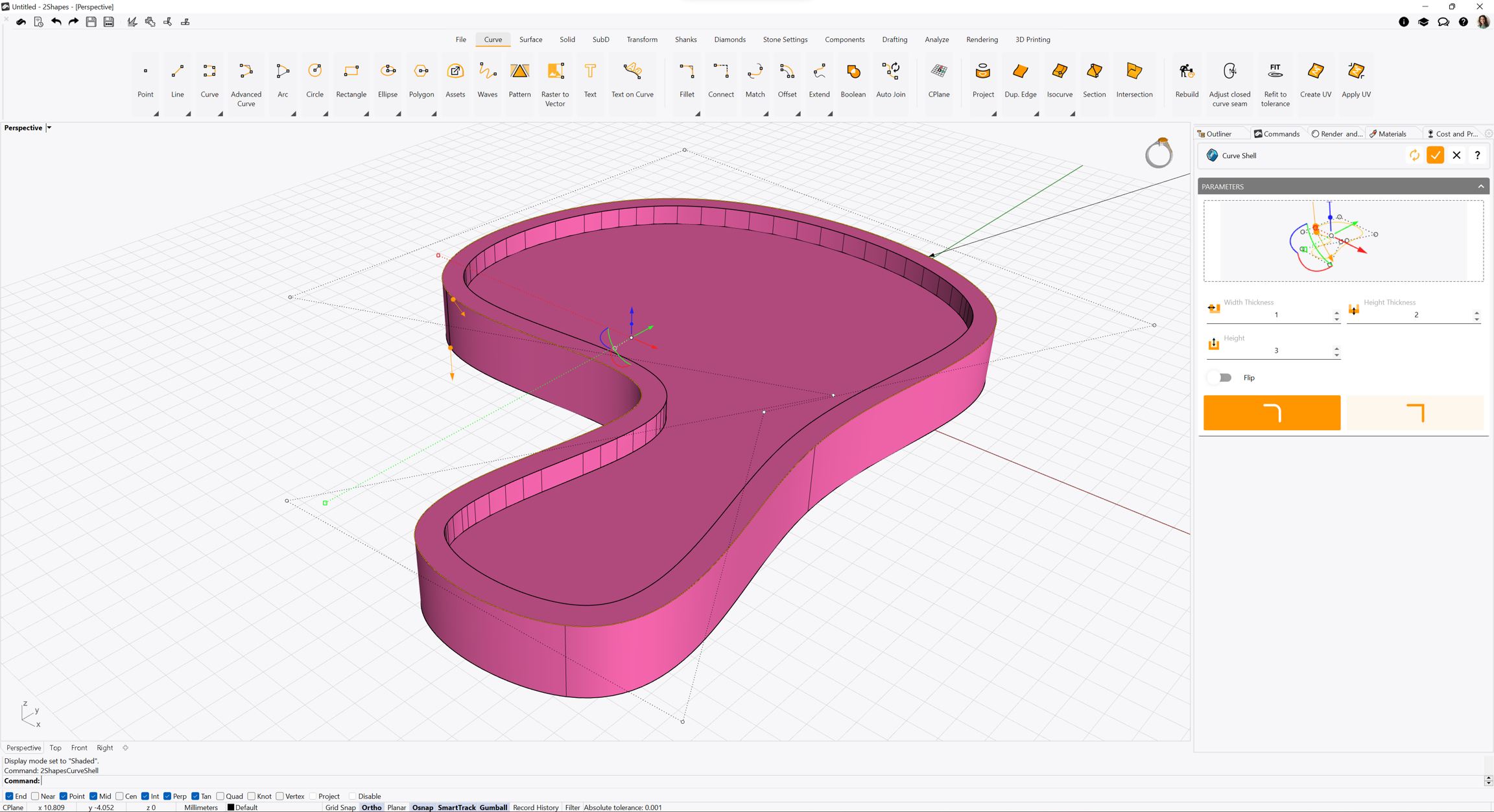 Curve ShellWith this command, you can select closed curves, and generate a shell-shaped solid, with a flat platform and vertical walls. This is especially useful to create solid surfaces where to set gems or Texture 3D.
